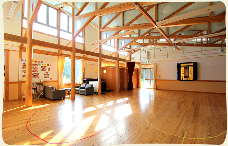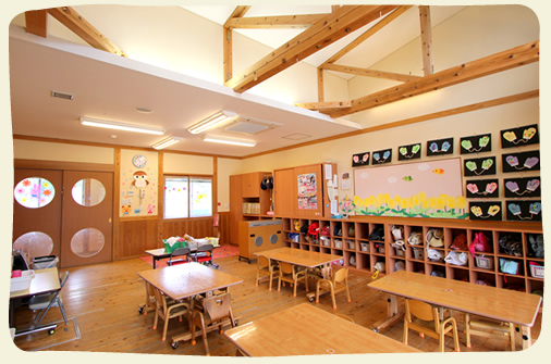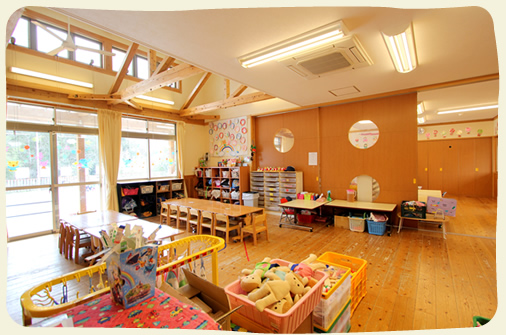 木材を使った園舎は陽の光がたくさん差し込むぬくもりある造りになっています。 子ども達が元気にのびのび過ごせるよう広い空間となっています。