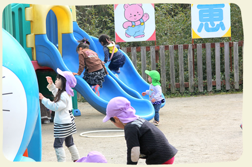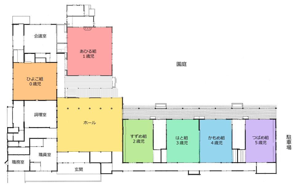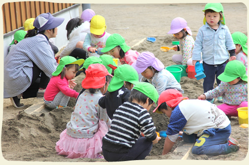 | 職員構成 | 園長1名 主幹保育教諭2名 保育教諭16名 栄養士1名 調理士1名 調理員1名 事務員1名 |