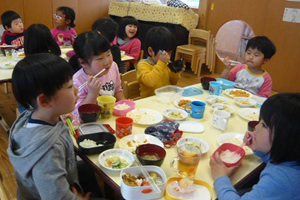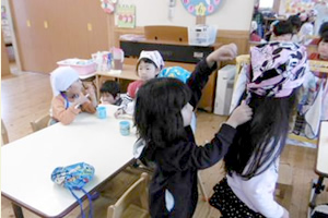 お友達と助け合いながら給食の準備をします。